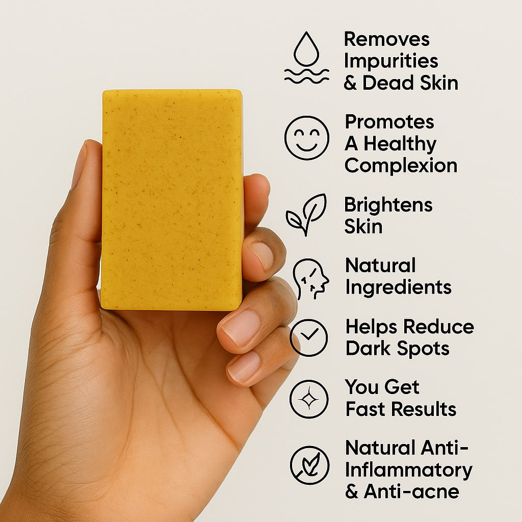 Crafted from all-natural ingredients, our Turmeric Soap is infused with potent properties that remove impurities and dead skin, revealing a radiant glow. With consistent use, it brightens skin tone and helps reduce dark spots, leaving your skin feeling refreshed and revitalized.